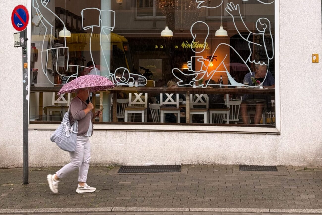 Sommerregen in der Stadt: Während es draußen auf das Café Livres prasselt, lockt drinnen warmes Licht und die perfekte Kulisse für eine Regenpause. [Foto: Cora Liebscher]