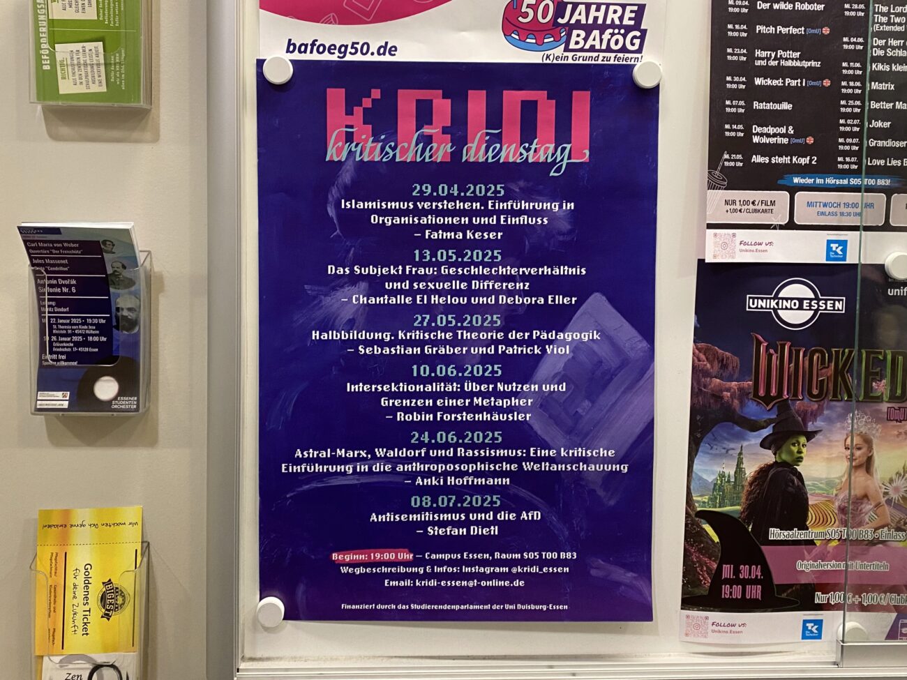 Feminismus, Antisemitismus, kritische Theorie – Marie und Sylvia* haben 2023 den Kritischen Dienstag (KriDi) am Campus Essen gestartet. Dabei ist jeden zweiten und vierten Dienstag im Monat ein offener Raum für Diskussion und Austausch zu verschiedenen Themen entstanden.