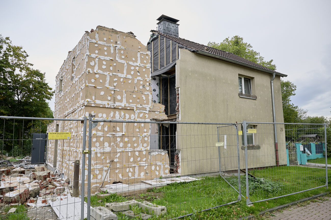 In der Siedlung Litterode sind bereits mehrere Doppelhäuser abgerissen oder abgesperrt – hier ist eine leerstehende Haushälfte mit einem Bauzaun gesichert, während die andere noch bewohnt ist. [Foto: Cora Liebscher]