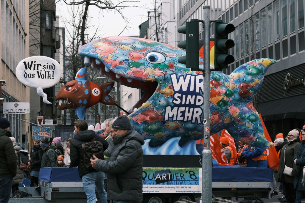 Am 15. Februar fand eine solche Demo auch in Düsseldorf statt. Einer kleinen Veranstaltung der AfD standen nach Schätzungen der Polizei 13.000 Demonstrant:innen gegenüber, die Organisator:innen der Demo “Düsseldorf stellt sich quer“ gehen sogar von fast 30.000 Demonstrierenden aus. Die Polizei zieht positive Bilanz: Zu nennenswerten Ausschreitungen sei es nicht gekommen. Auf der Demo sah man große Polizeipräsenz, viele clevere Sprüche und Pappmaché-Wagen des politischen Karnevalswagenbauers Jacques Tilly. Viel Spaß beim Durchklicken/Durchscrollen der kommentierten Bilder!