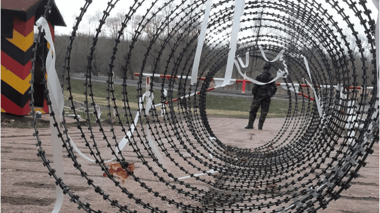 Ein junger Soldat steht hinter einer Schranke. Der NATO-Stacheldraht ist mit Reflektorbändern behangen, damit er auch nachts erkennbar ist. Im Kriegsfall würden solche Checkpoints Kasernen und Munitionsdepots, aber auch Krankenhäuser und Hilfslager schützen. (Foto: Anton Vierkant März 2024)